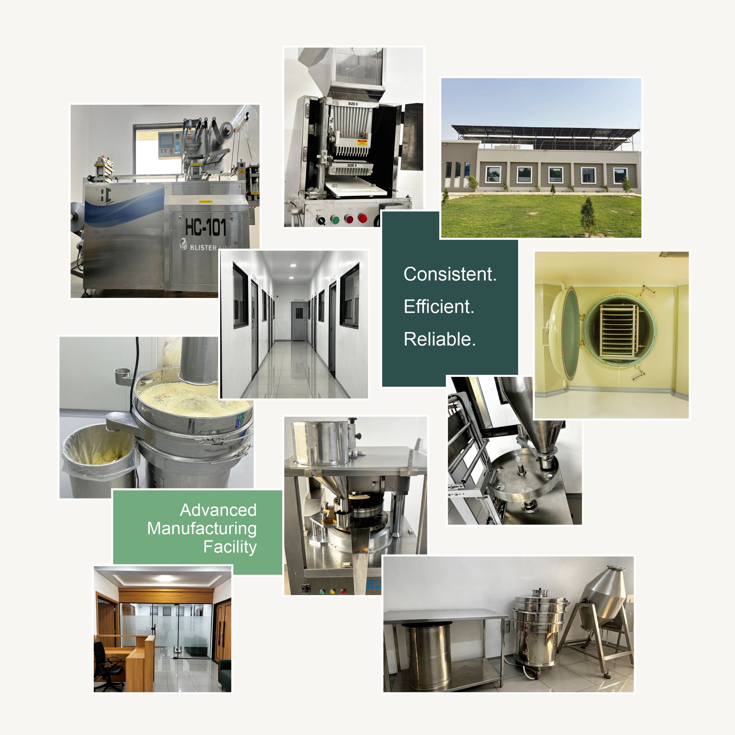 Specialized equipment for various dosage forms including tablets, capsules, powders, gummies, and liquid supplements.